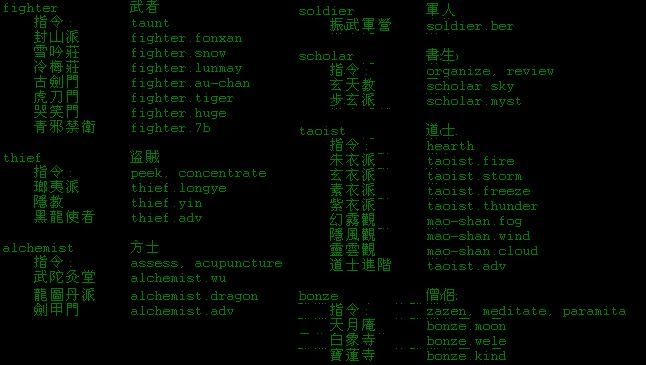 。在遊戲中可以輸入 help class 指令來查看更為詳細的介紹。這裡只對各個職業和其下屬門派稍做介紹並推薦一些較為優秀的